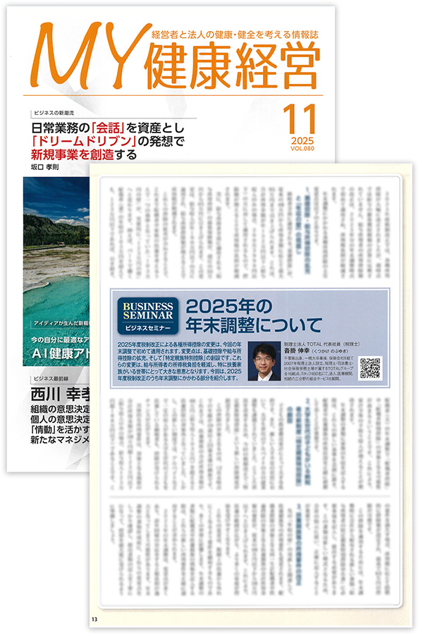 メディア掲載情報 media 2025.10.23 メディア掲載情報 保険会社様の雑誌に『2025年の年末調整について』を寄稿しました(2025.11) TOTALグループ 税理士法人TOTAL 代表社員税理士 沓掛伸幸が執筆しました。 テーマ 2025年の年末調整について 執筆税理士 税理士法人TOTAL 代表社員税理士 沓掛伸幸