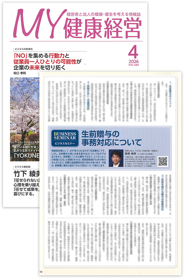 メディア掲載情報 media 2026.03.27 メディア掲載情報 保険会社様の雑誌に『生前贈与の事務対応について』を寄稿しました(2026.4) TOTALグループ 税理士法人TOTAL 代表社員税理士 沓掛伸幸が執筆しました。 テーマ 生前贈与の事務対応について 執筆税理士 税理士法人TOTAL 代表社員税理士 沓掛伸幸