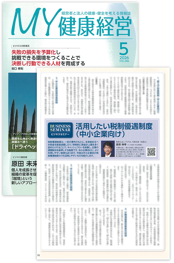 保険会社様の雑誌に『活用したい税制優遇制度(中小企業向け)』を寄稿しました(2026.5)